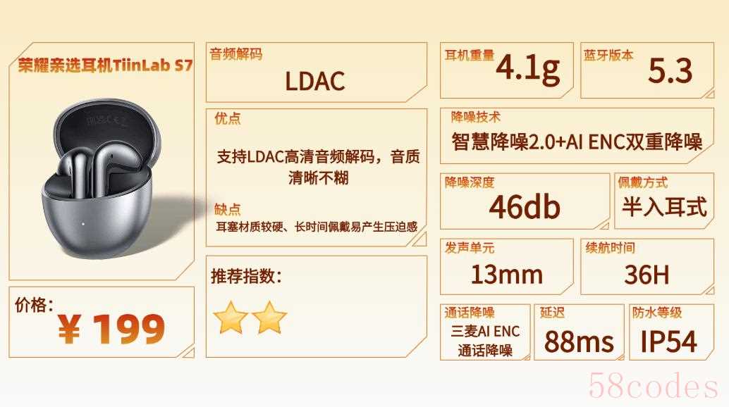 西圣AVA2 Pro耳机在佩戴上几乎感觉不到有耳机的存在。采用第四代半入耳体感科技,并经过多次人体实际佩戴测试,确保更好地符合国人的耳廓,提供了舒适度和牢固度的完美结合。每只耳机仅重4克,通过Buoyancy人体工学设计,从耳机的曲面、角度等方面精心打磨成6面黄金环形支撑,即使佩戴一整天也不会感到耳朵酸胀,在同类产品中独树一帜,赢得了消费者广泛的好评。大部分蓝牙耳机在游戏时使用都会有很明显的延迟,但西圣不会,搭载新一代蓝牙5.4芯片,性能更加强劲,抗干扰性更出色,游戏模式下延时低至50ms,用它来玩游戏能做到音画同步,非常适合游戏党使用!支持3Mic+AI通话降噪、续航25小时,好声音一直听,配置非常能打,没有哪个平价产品能做到。品牌2、荣 耀亲 选耳机TiinLab S7蓝牙耳机