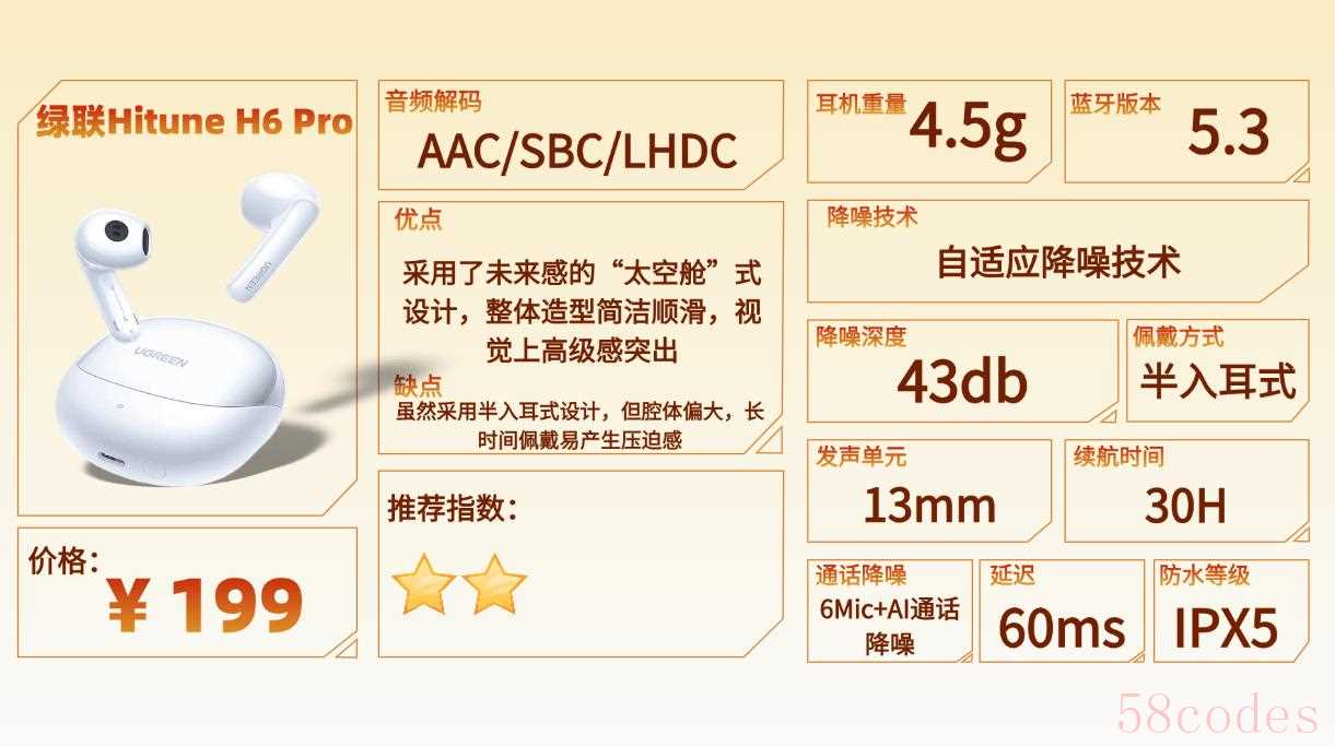 硬件配置上,内置12mm动圈单元和大尺寸生物纤维振膜,解析力表现不错,低频下潜有力,整体听感饱满。配备的双麦克风支持智能环境降噪,即使在嘈杂环境中通话也能保持清晰。但在实际试听中,高频的延展性稍显一般,中频部分的细腻度不够,对于追求极致音质的用户来说可能还不够完美。蓝牙5.3芯片加持,保证了连接的稳定和快速响应。续航表现同样亮眼,耳机单次可连续使用8小时,加上充电仓能提供约32小时续航,基本能满足一周的通勤需求。品牌10、绿 联H itune H6 Pro蓝牙耳机
