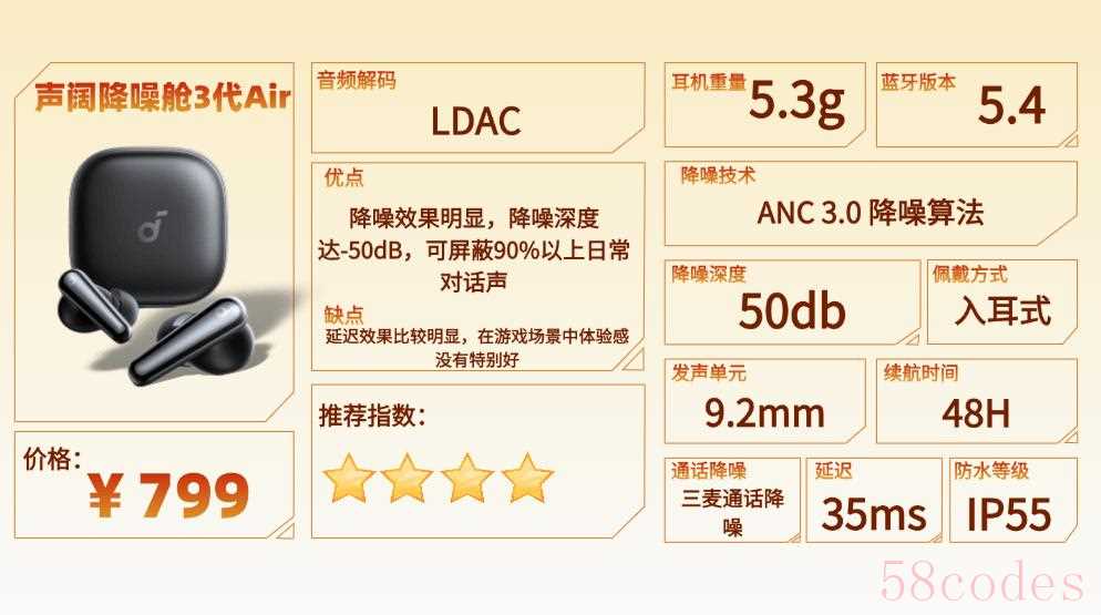音质配置上,它配备了定制级13mm动圈单元,振幅0.4mm,结合LDAC高清传输,保证了声音的层次感和细节表现,但开启高清传输延迟相对也会变高。功能方面支持智慧降噪2.0与AI ENC通话降噪,能够根据环境动态调节,语音交流也更清晰。蓝牙5.3带来稳定连接,并支持双设备切换与游戏模式,延迟较低。续航部分,耳机单次续航约7.5小时,搭配充电盒综合使用时长可达36小时,完全可以覆盖日常高频使用场景。品牌3、声 阔降 噪舱3代Air蓝牙耳机