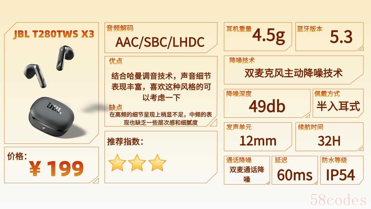 它的音质表现同样有看点,搭载了LHDC 5.0高清音频协议,解析力比AAC强不少,再加上Hi-Res认证以及OPPO金耳朵团队的DeepX立体声效调校,声音在低频和中频表现尤其出色,细节丰富。蓝牙5.4保证了日常连接的稳定性和低延迟,续航方面更是惊喜,单次可用12小时,总续航能达到44小时。但要提醒的是,想体验到LHDC的最佳效果,还需要使用兼容该协议的设备。品牌9、J BL T 280TWS X3蓝牙耳机