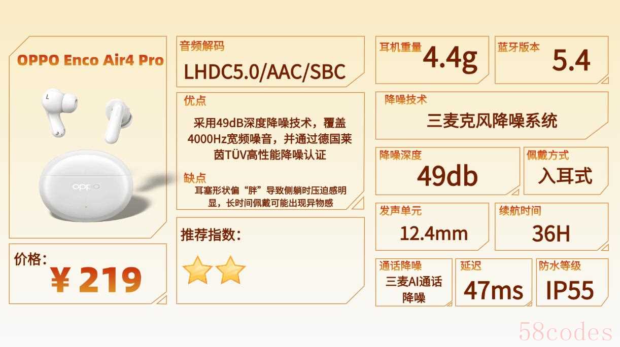 音质上支持aptX Lossless无损传输,能很好地保留细节和层次感,配合14.2mm大动圈单元,声音更立体,人声清晰自然。蓝牙5.3的加持让连接稳定可靠,不容易出现断连情况。续航方面,单次6小时播放,配合充电仓可额外提供6.8次充电,并且具备快充功能,从零到满电仅需40分钟。唯一的小遗憾是,录音和转写功能必须依托小米耳机App,对非小米设备的适配并不是特别完善。品牌8、O PPO E nco Air4 Pro蓝牙耳机