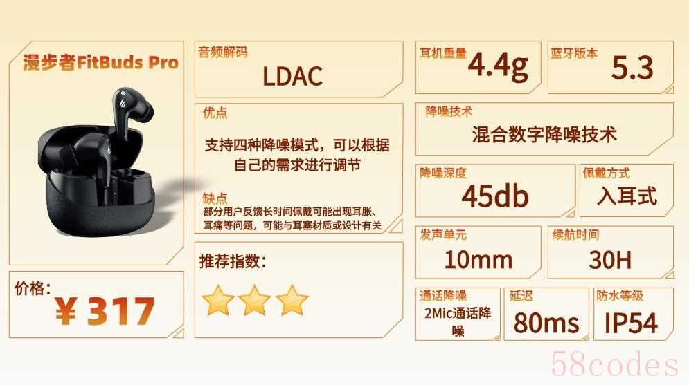 在音质方面,它配备10mm复合生物振膜单元,并搭载高通S3芯片,支持aptX无损传输与LDAC解码,还具备Hi-Res小金标认证,整体声音清晰,人声细节表现不错。但低频深度稍欠,重低音爱好者可能会觉得不够过瘾。蓝牙版本为5.4,保证了稳定快速的连接。续航方面单次播放7.5小时,总续航可达37小时,完全能满足高频使用需求。品牌5、漫 步者F itBuds Pro蓝牙耳机