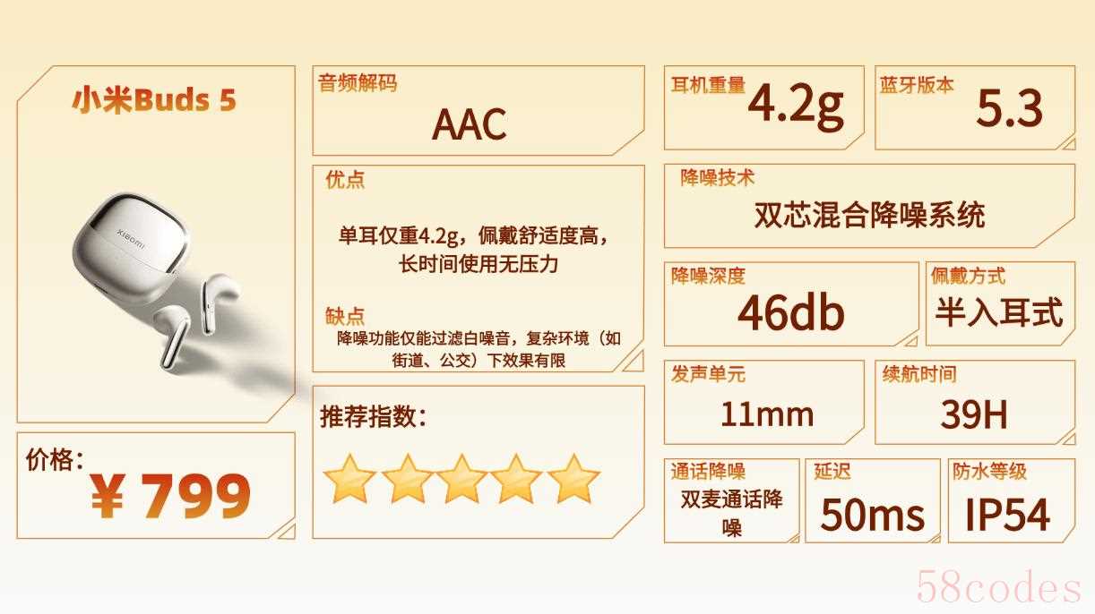 配置上使用了12.2mm单元搭配陶瓷钨原声振膜,支持Hi-Res小金标和DeepX 3.0立体声效。声音层次感不错,空间感饱满,但细节表现上还有提升空间。蓝牙升级到5.4版本,连接延迟比上一代改善不少。续航表现也比较实用,开启降噪单次能听6小时,搭配充电仓最长可达26小时,日常通勤基本一周一充电就够用了。品牌7、小 米B uds 5蓝牙耳机