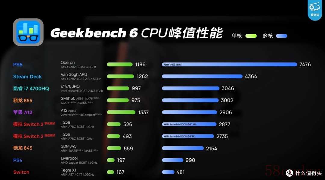再来看看CPU方面,由于Switch2的CPU主频实在是太低,导致这颗CPU的单核表现非常之拉。不过也不要紧,游戏机都是有多核优化的,多核性能够用即可。