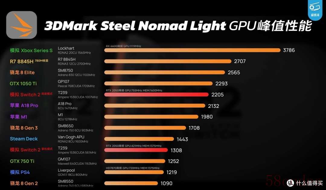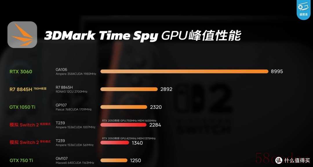 确实,Switch2的性能不算dlss确实没比PS4好到哪去,根据极客湾的模拟性能测试,在GPU方面,Switch2的掌机模式只比750Ti强一点,底座模式基本和1050Ti平起平坐。对标移动端呢,掌机模式差不多是Steam Deck的水平,强于骁龙8Gen2。底座模式则比较强,超越了苹果的A18Pro。