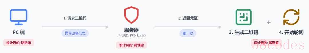 - PC端发起请求:PC向服务器申请生成二维码,并上报设备信息(设备ID、IP地址等)