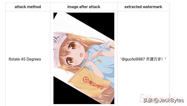 - 强抗攻击性:能够抵抗多种常见的图片处理攻击,包括旋转(如旋转 45 度)、随机裁剪、遮挡、缩放、添加椒盐噪声、调整亮度等,仍能准确提取水印。