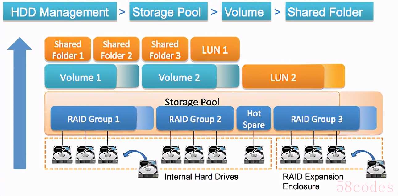 物理硬盘 HDD/SSD 构成存储池 Storage Pool,存储池之上划分卷 Volume,卷上划分共享文件夹 Shared Folder。