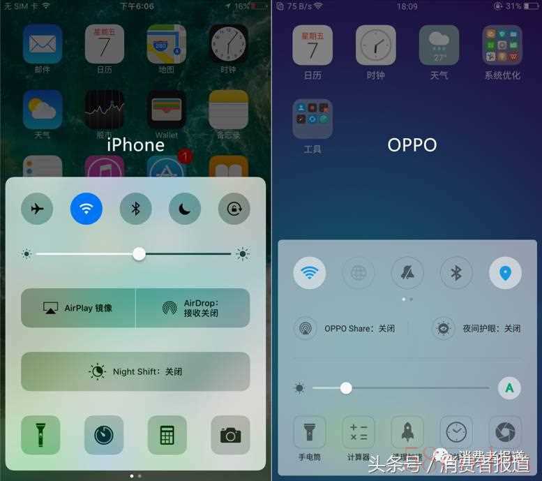 那两者又有什么相似之处?嗯,或许是相同的听筒和前置摄像头靠空位置;或许是同样突出的后置双摄摄像头以及圆形闪光灯;或许是使用了极其相似的桌面图标、系统设置菜单分布、极其相似的屏幕底部上滑呼出控制界面和那个OPPO share、相似的相机/相册界面排版。