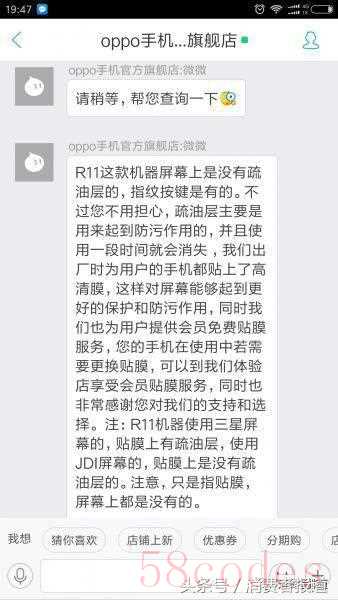 根据天猫OPPO手机官方旗舰店回复咨询者的记录来看,R11的屏幕是没有疏油层的,而且连官方自带的贴膜也有可能没有疏油层(具体要看是哪个屏幕版本的R11)。