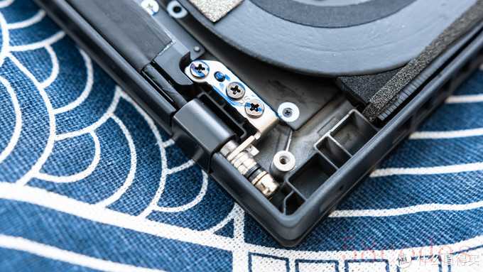 最后我们来看看ThinkPad X1 Carbon 2019的背盖,可以看到开孔部分都有遮罩或者海绵,起到防尘防灰的效果。或许有人还会好奇那个黑膜的作用,前面的元器件也出现颇多,它主要是起到屏蔽的效果。