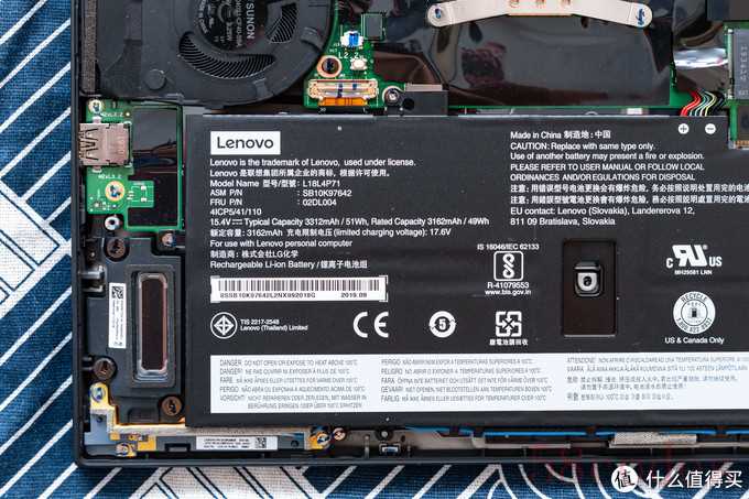 电池方面,ThinkPad X1 Carbon 2019搭载的是51Wh锂离子电池组,体积比较壮观,基本覆盖了整个下方空间。