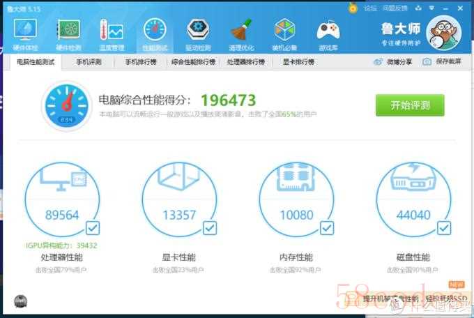 鲁大师测试得分196473分,其中CPU得分89564分,显卡性能13357分,内存性能10080分,磁盘性能44040分。