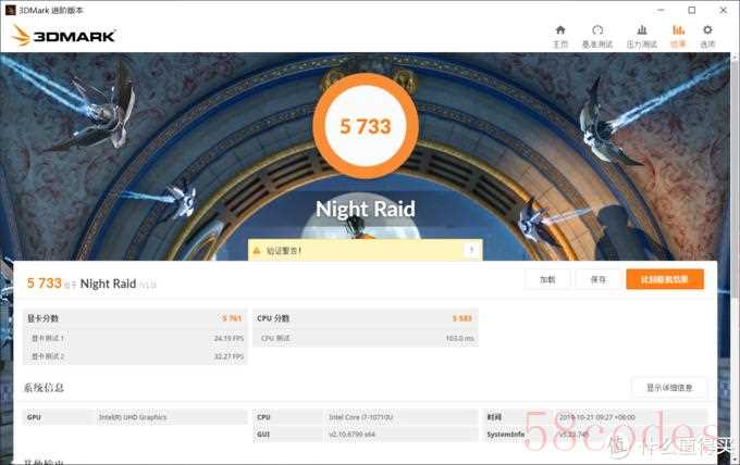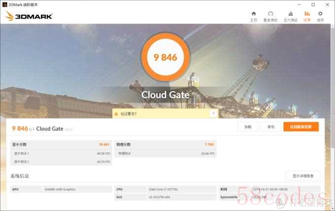 通过3DMark的Night Raid、Cloud Gate的场景测试,可以看到分别得分5733分、9846分。