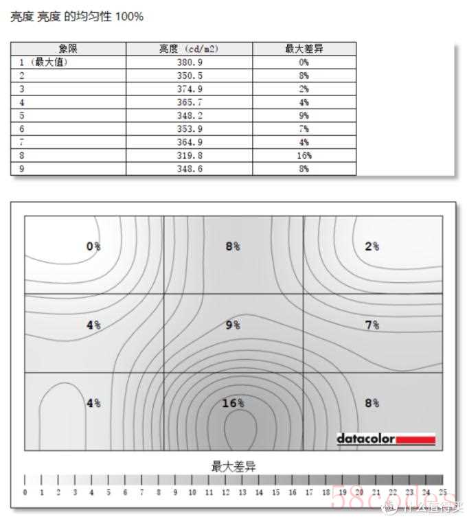 在亮度一致性上,ThinkPad X1 Carbon 2019的1号区域最亮,正下方的8号区域最暗,整体上上亮下暗。