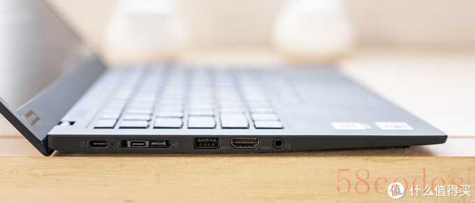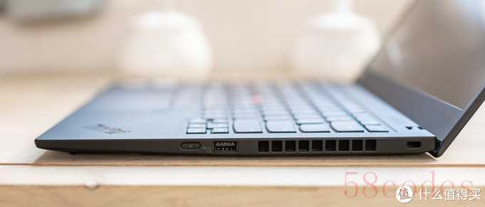 然后我们来看看ThinkPad X1 Carbon 2019的侧面,左侧端口相对丰富,包括了两个Thunderbolt 3端口,最高40Gbps信息传输速率,同时支持4K 60Hz的视频输出。