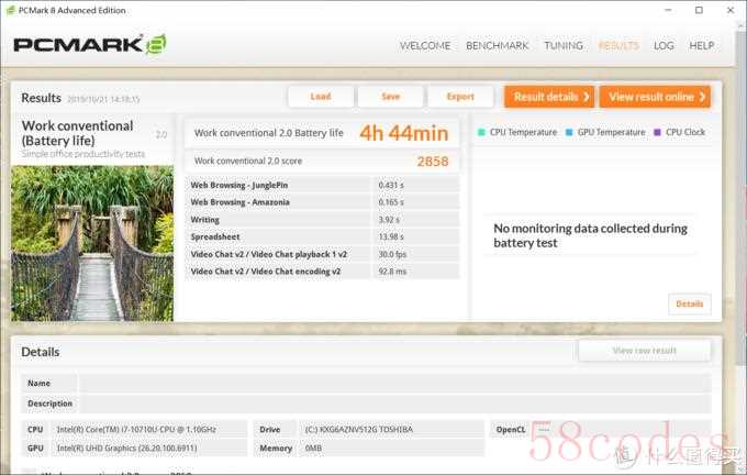 理论续航表现方面,首先我们借助PCMark 8的Work 2.0场景测试,电脑使用电池且打开长续航模式。经过长时间的测试后,可以看到给出的预计续航时间为4小时44分钟。