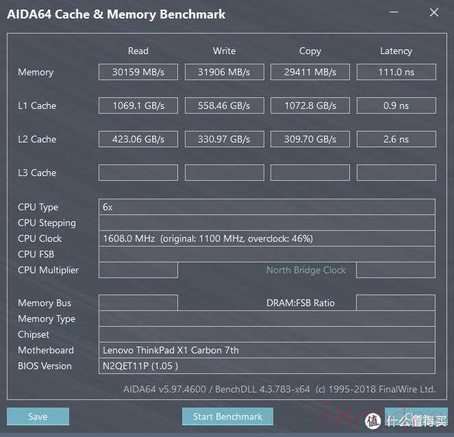 【内存】:ThinkPad X1 Carbon 2019的内存为16GB,应该是板载的双通道内存,网上查询的规格为LPDDR3-2133MHz,AIDA64实测读速为30159MB/s、写速为31906MB/s。