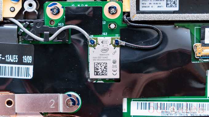 网卡则位于上部,搭载的是intel家的9560D2W,支持双频2.4G/5G频段和MU-MIMO,最大网速为1.73Gbps ,(需路由器支持160Mhz带宽),集成蓝牙5.0。