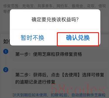 5、我们需要用30芝麻粒兑换此修复功能,点击确认兑换,再点击去使用就可以恢复一次逾期记录啦。