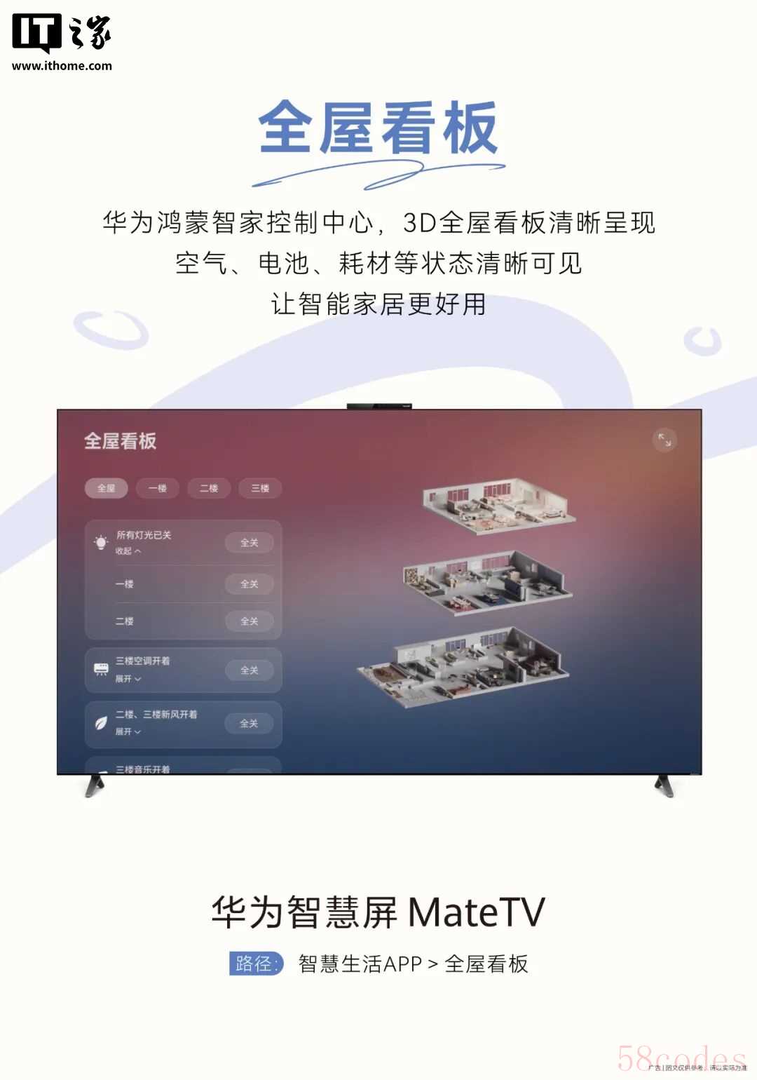 华为智慧屏 MateTV 获得大版本 OTA 升级,新增全屋看板等功能,这意味着华为智慧屏的用户可以享受到更多便捷和智能化的功能体验。全屋看板功能可以整合家庭中各种智能设备的信息,为用户提供一个统一的控制和管理平台,让用户可以更加方便地控制和管理家中的智能设备。此外,此次升级还可能带来其他一些新的功能和改进,为用户带来更好的使用体验。