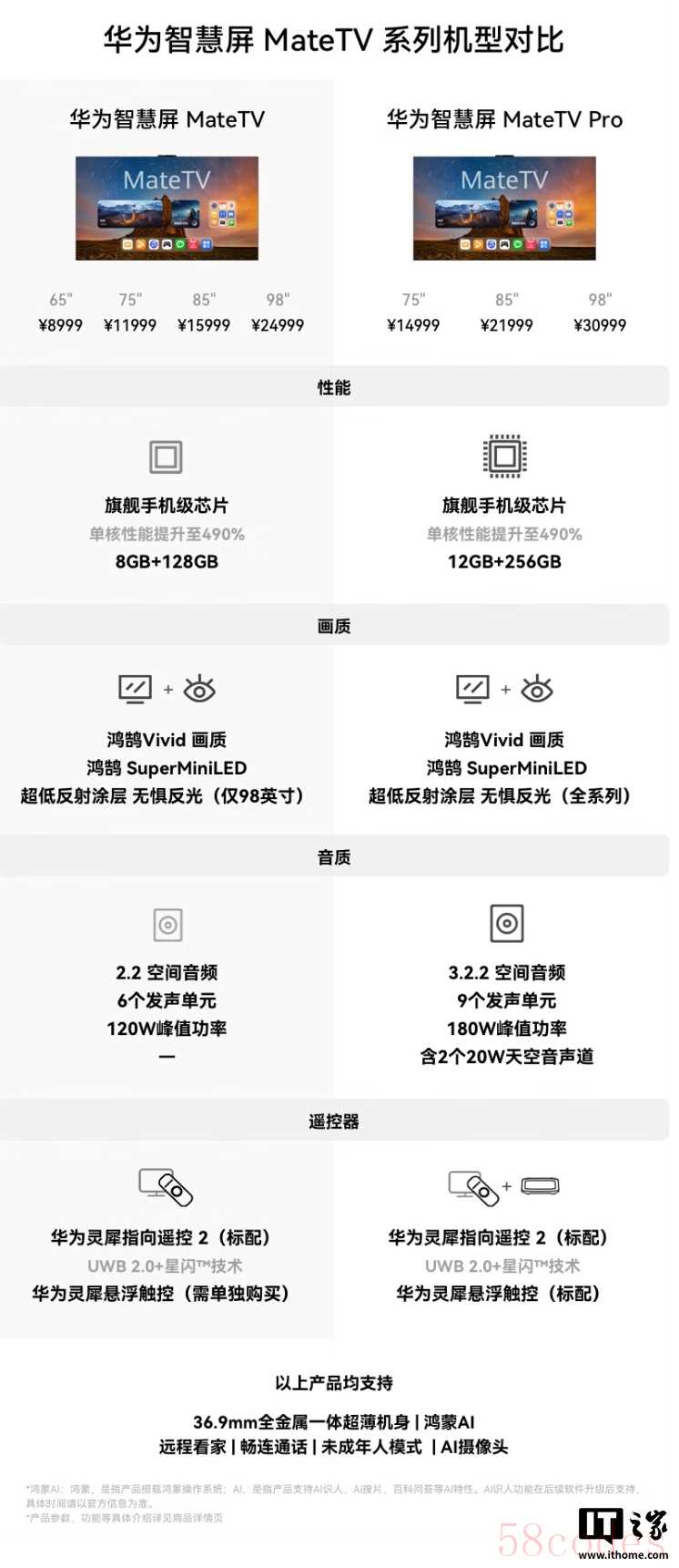 画质上,MateTV 搭载“鸿鹄 Vivid”独立画质芯片,采用 Super Mini LED 黑钻屏,配合多晶量子点膜还原自然色彩,黑钻全景臻彩液晶补偿技术实现 178° 超广视角,商品页面显示其支持千级背光分区以及 4000 尼特巅峰亮度。软件端,鸿鹄 AI 计算画质技术还通过“AI 光感增强”优化画面,支持自研 HDR Vivid 与 Audio Vivid 标准。