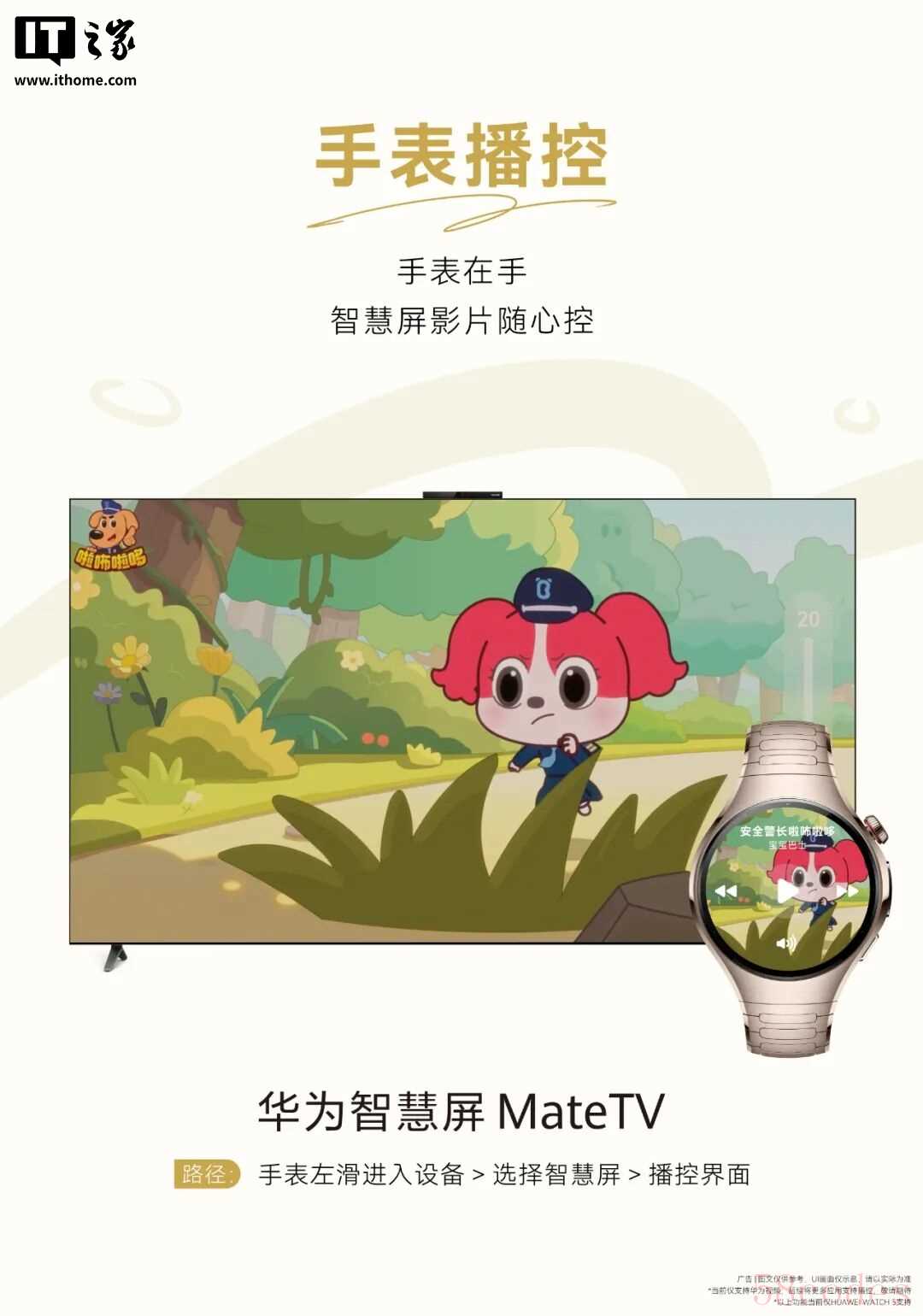 - 手表播控:支持手表控制智慧屏影片播放,可快进、暂停、调节音量等