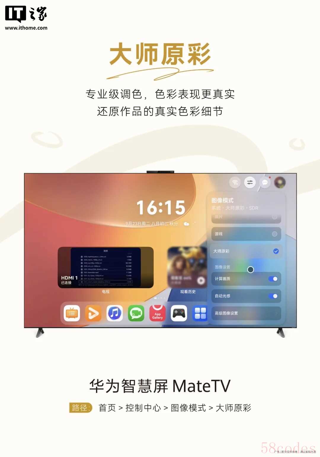 IT之家 10 月 18 日消息,据华为智慧生活官方昨日晚间消息,“史上最大 Mate”—— 华为智慧屏 MateTV 已开启大版本 OTA 升级(具体版本号官方暂未公布),新增支持鸿蒙生态无缝接续、大师原彩画质模式、联动 3D 全屋看板等功能。