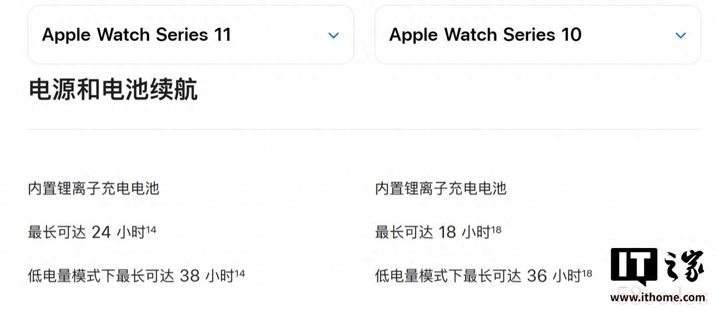 IT之家 9 月 13 日消息,科技媒体 MacRumors 昨日(9 月 12 日)发布博文,报道称苹果 Apple Watch Series 11 满电续航可以达到 24 小时,相比较 Series 10 的 18 个小时有明显提升,但网友细查后发现,续航提升并非硬件大幅升级,而是测试方法加入了低功耗的睡眠追踪环节。
