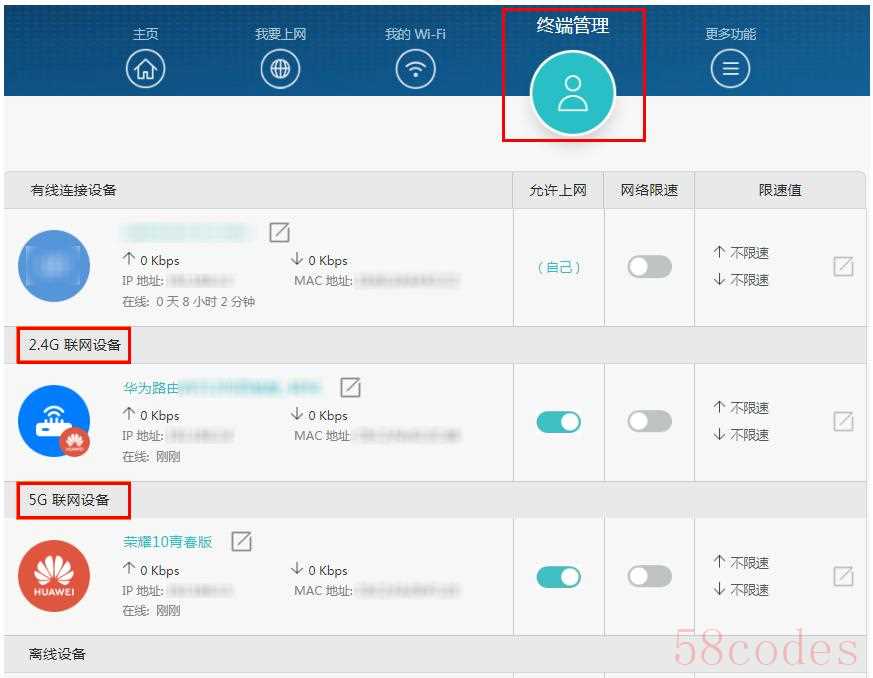 以华为双频路由器为例,在浏览器地址栏中输入192.168.3.1,登录路由器 Web 管理界面,点击进入【终端管理】即可以查看。