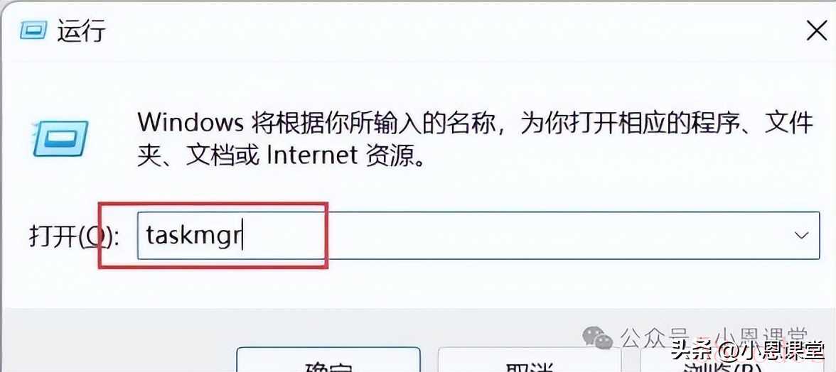 2. 在“运行”对话框中,输入 `taskmgr`。