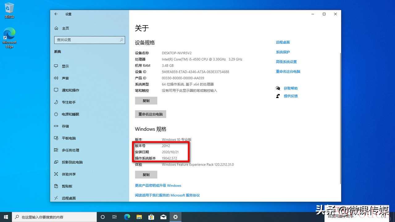 4. 在右侧窗格中,找到“版本”字段。如果显示的是“10.0.19042.1”,则表示你的电脑安装了Windows 10 20H2。