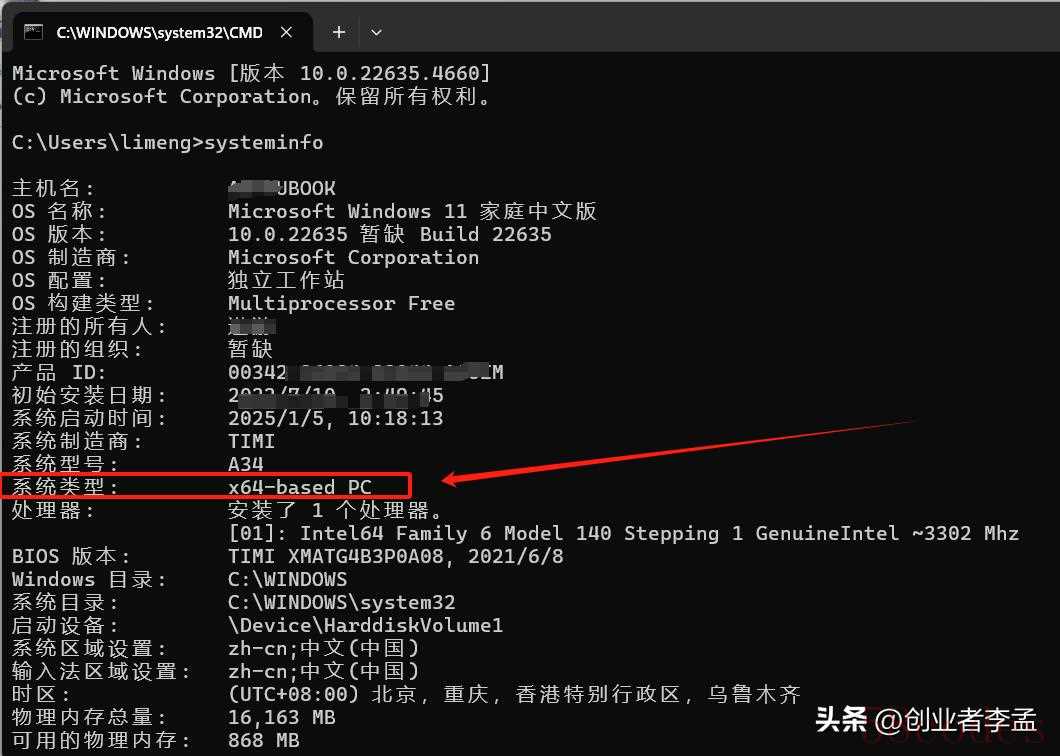 第二招,使用命令行来查看:您把命令提示符打开(先按下“Win+R”,然后输入“cmd”),接着输入“systeminfo”这个命令,在输出的那些信息里面找找“系统类型”,这儿就会显示出是 32 位还是 64 位的操作系统。