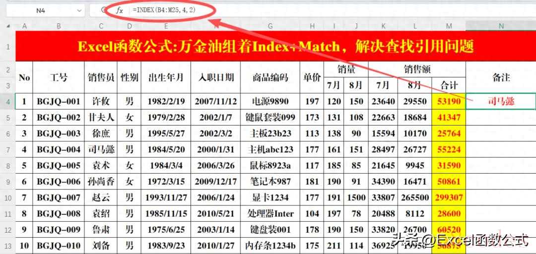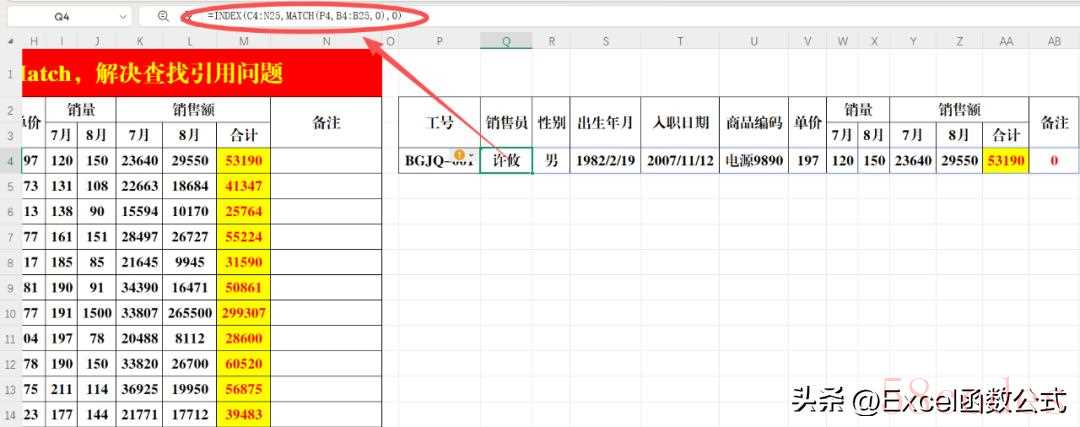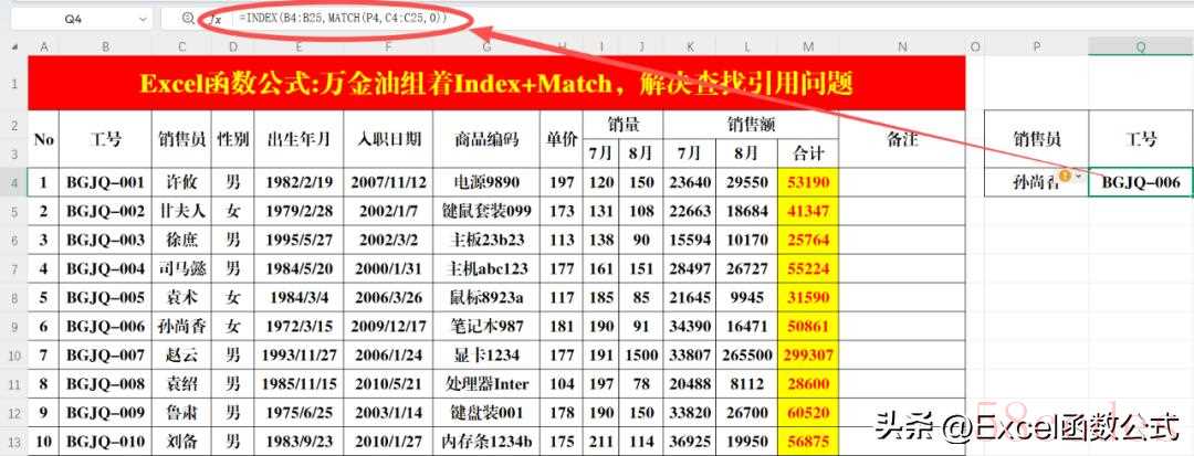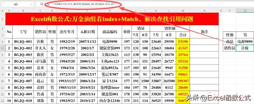 操作方法:在目标单元格中输入公式:=INDEX(C4:N25,MATCH(P4,B4:B25,0),0)。原理解读:当Index函数的第三个参数为0时,返回数据范围中的所有列。4.多条件查找目的:查询销售“电源9890”的男销售员姓名。