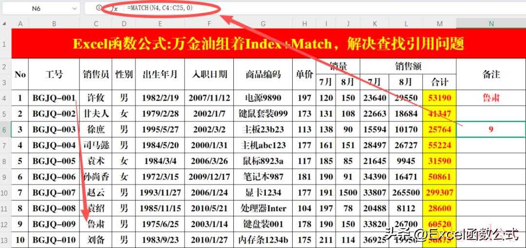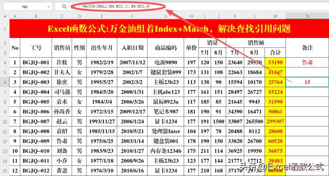 操作方法:在目标单元格中输入公式:=MATCH(N4,C4:C25,0)。目的2:返回最小销售额的位置