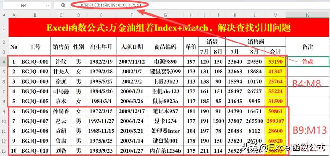 查找引用技巧是Excel(WPS表格)永久不衰的话题,也是每位办公室同学必备的技能之一。Index+Match是一对万金油的查找引用技巧,Match函数负责定位,Index函数负责提取,两者结合,可以发挥出意想不到的效果,如果对Excel(WPS表格)不是特别熟悉的同学,可以先收藏,以备不时之需。一、基础功能及语法结构(一)Index函数1.功能:在给定的单元格区域中,返回特定行列交叉处单元格的值或引用。2.此函数具有两种语法结构。数组形式:=Index(数组,行序列,,)。向量形式:=Index(数组区域,行序列,,)3.参数解读:(1)数组或数组区域,必须:需要返回数据的范围。当为向量形式时,数组区域可以是多个,如果是非邻的,必须用()括起来。(2)行序列,必须:要返回值的所在行的索引。(3)类序列,可选:默认值为1,从左向右依次为2、3……(4)区域序数,可选:默认值为1,从左向右依次为2、3……4.应用技巧目的1:返回第4行第2列的值。