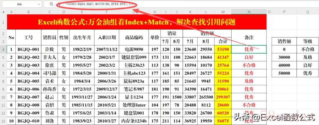 操作方法:在目标单元格中输入公式:=INDEX(C4:C25,MATCH(Q3&Q4,D4:D25&G4:G25,0))。原理解读:在Match函数中,将定位值和数据范围用&链接即可完成多条件查询。5.区间查询目的:根据销售额和登记分配表,返回对应的等级。
