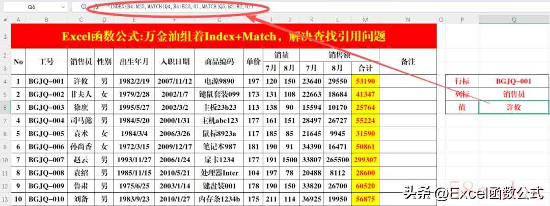 操作方法:在目标单元格中输入公式:=INDEX(B4:M25,MATCH(Q4,B4:B25,0),MATCH(Q5,B2:H2,0))。原理解读:首先用Match函数定位出“行标”、“列标”的位置,然后利用Index函数返回具体的值。3.一对多查询目的:返回销售员的所有数据。