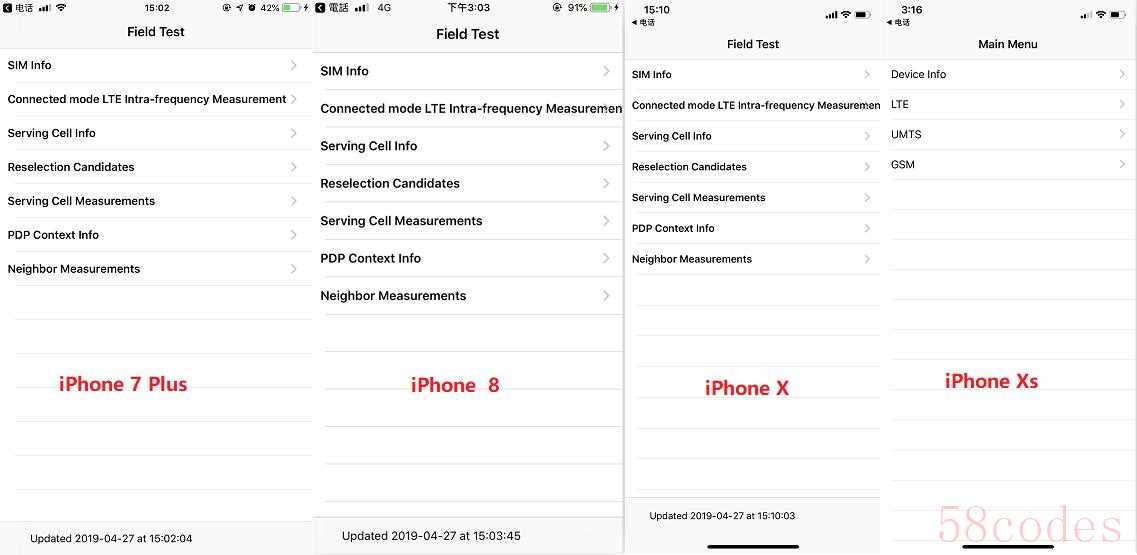 小编找了四款手机分别进行测试,其中iPhone 7 Plus、iPhone 8、iPhone X均为高通基带,而iPhone Xs为英特尔基带。值得注意的是,同款机型并不一定是一样的基带哦,有些用户使用的iPhone 7 Plus就是英特尔基带。