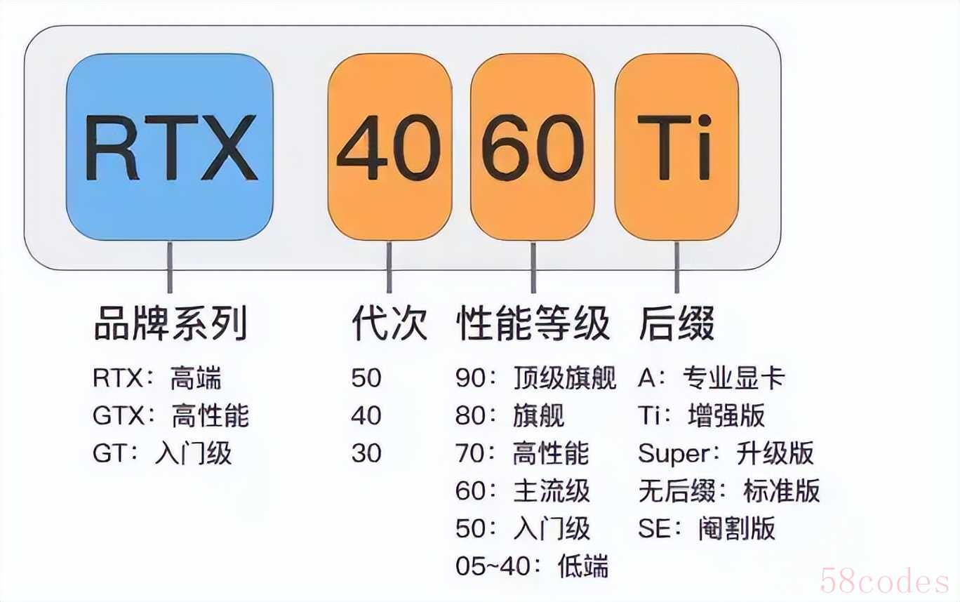 性能等级由后两位数字表示,例如4060,“60”代表性能等级,“60”“70”“80”等,数字越大,性能越强。