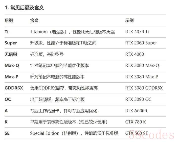 NVIDIA显卡型号通常遵循 `[系列代号] + [核心数量] + [显存容量] + [后缀]` 的模式。后缀部分可能包含功耗、散热等信息。