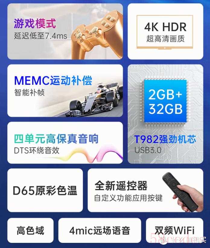 存储和内存方面,是2GB+32GB,玩游戏可能有些吃力,看视频日常够用。这款电视屏幕是4K分辨率,支持高色域,搭配USB3.0和双频WiFi,并且支持4米醋远场语音。