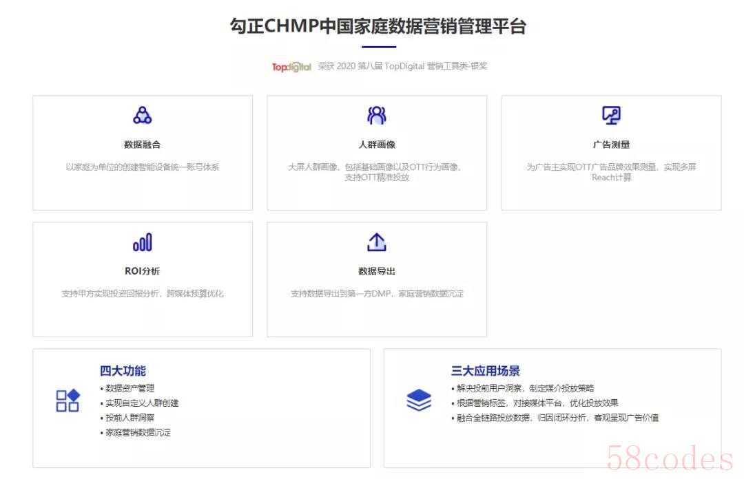 从其官网上,可以看到勾正数据提供的产品功能包括人群画像、广告监测、实现自定义人群创建、投前人群洞察、家庭营销数据沉淀等(勾正数据官网截图)