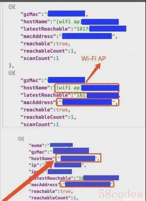 代码中显示hostname、mac、ip甚至网络延迟时间都会上传,还探测了周围的wifi SSID名称、mac地址