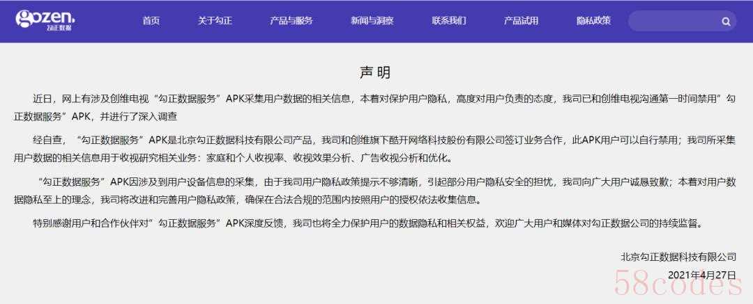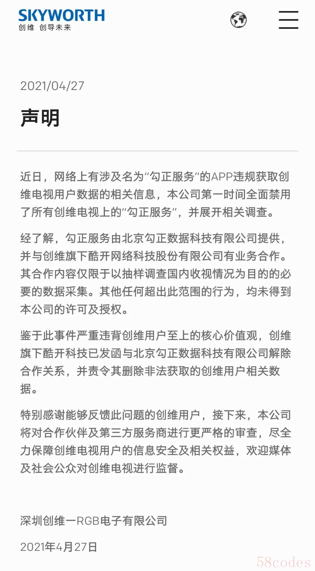 在线索曝光了4天后,4月27日,创维电视在官网作出回应,“锅”全甩给了勾正数据。