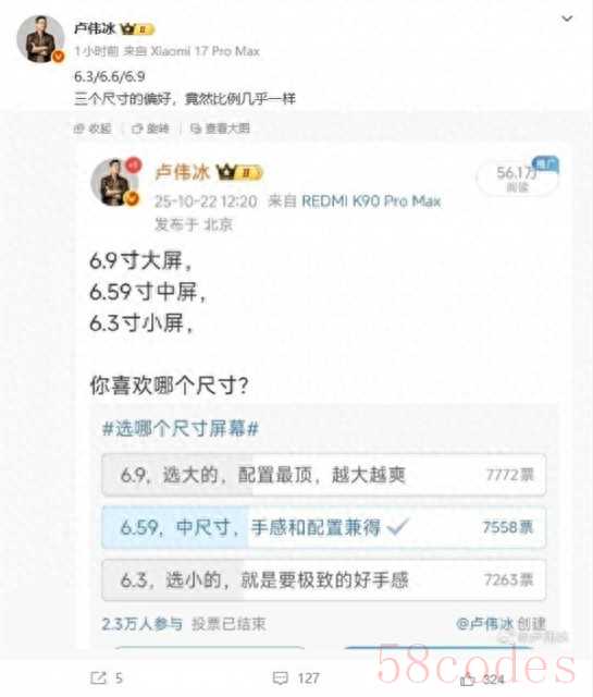 为了解消费者对不同屏幕尺寸的偏好,小米集团总裁卢伟冰发起了一项投票,吸引了2.3万人参与。令人意外的是,投票结果显示三种屏幕尺寸的得票数相当接近:6.9寸大屏以7772票暂时领先,6.59寸中屏获7558票紧随其后,6.3寸小屏则有7263票。卢伟冰对此感慨道:"6.3/6.6/6.9三个尺寸的偏好,竟然比例几乎一样"。