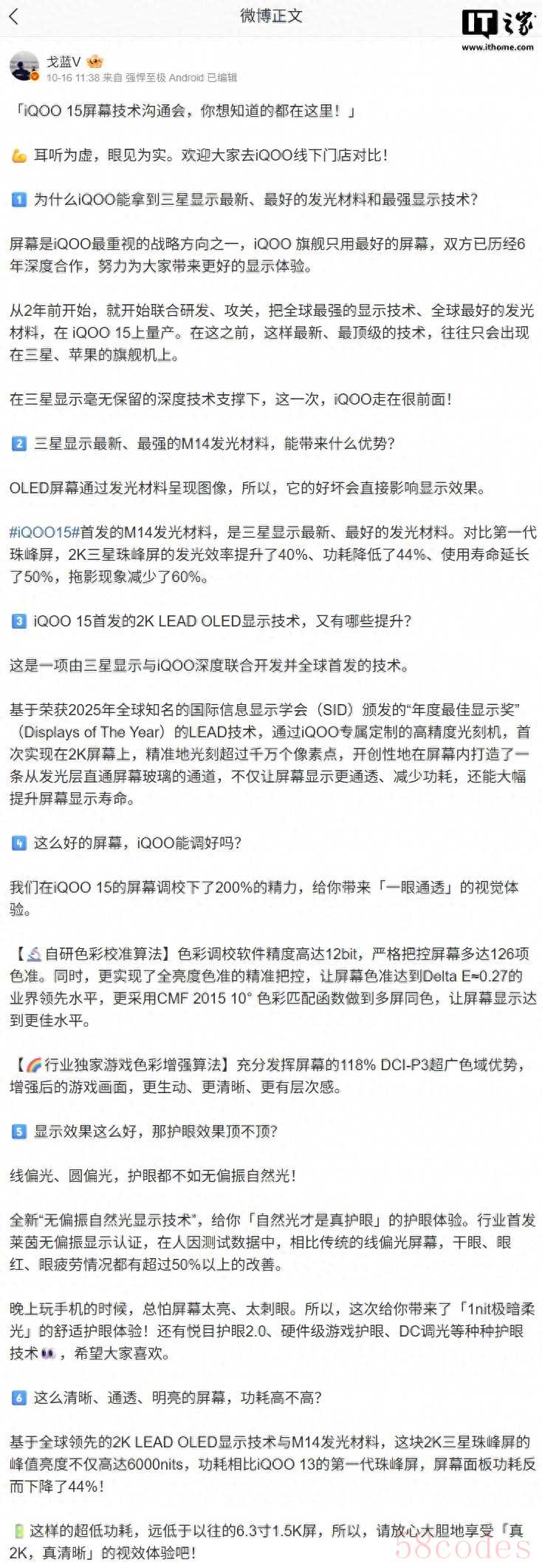 IT之家 10 月 19 日消息,iQOO 产品经理 @戈蓝V 于 16 日分享了 iQOO 15 屏幕技术沟通会的主要内容,这款新机将于明日发布。