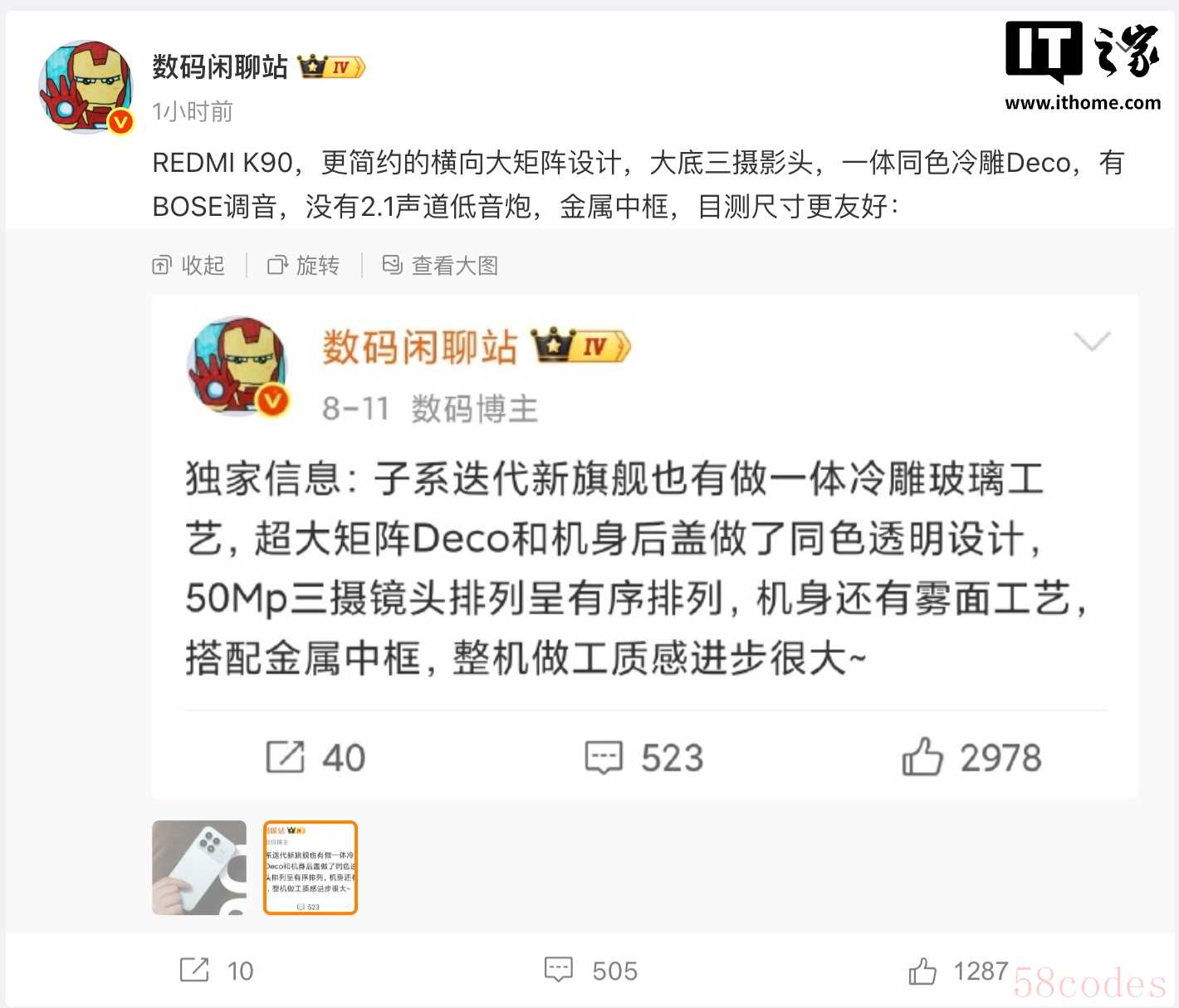 同样在今天上午,博主 @数码闲聊站 放出了这款手机的部分信息:更简约的横向大矩阵设计、大底三摄、一体同色冷雕 Deco,有 BOSE 调音但没有 2.1 声道低音炮,并采用金属中框。该博主曾在今年早些时候的爆料中提到,“整机做工质感进步很大”。