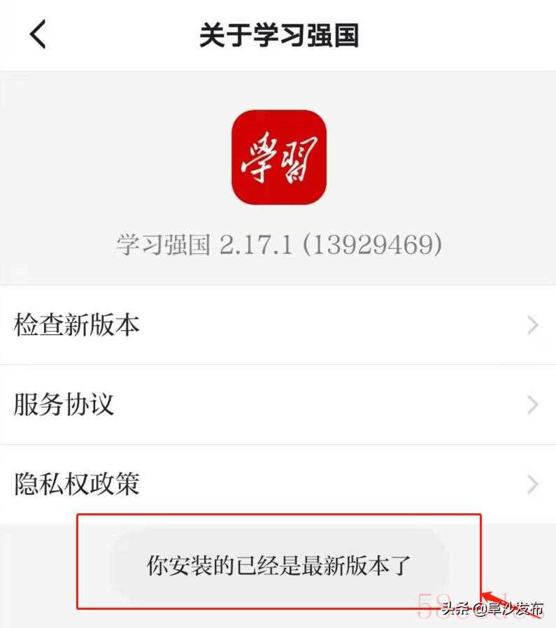 第四步,在“关于学习强国”界面,点击“检查新版本”按钮。检查后,如果有新版本,系统会弹出更新对话框,直接点击“更新”,更新完成后点击安装就可以了;如果您的版本已经是最新版本,会出现“已经是最新版本”的提示。