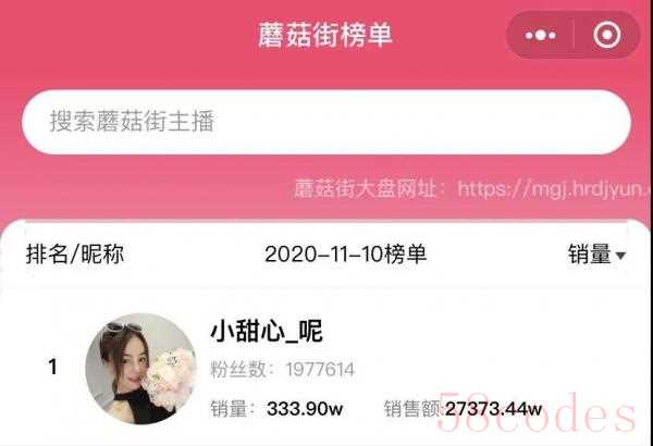 11月10日下午,蘑菇街发布战报:截至11月10日12点05分,蘑菇街主播小甜心直播成交额破亿,成淘宝、抖音、快手之外的第一个亿级(成交额)主播。